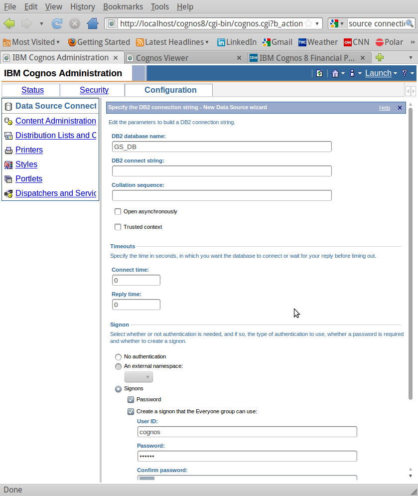 Leave everything else blank/default, except under Signon. Select Signons, Password, and 'Create a signon that the Everyone group can use.' Then enter the database user ID and password... in my case this is cognos / cognos. Then click the 'Test connection' link at the bottom.